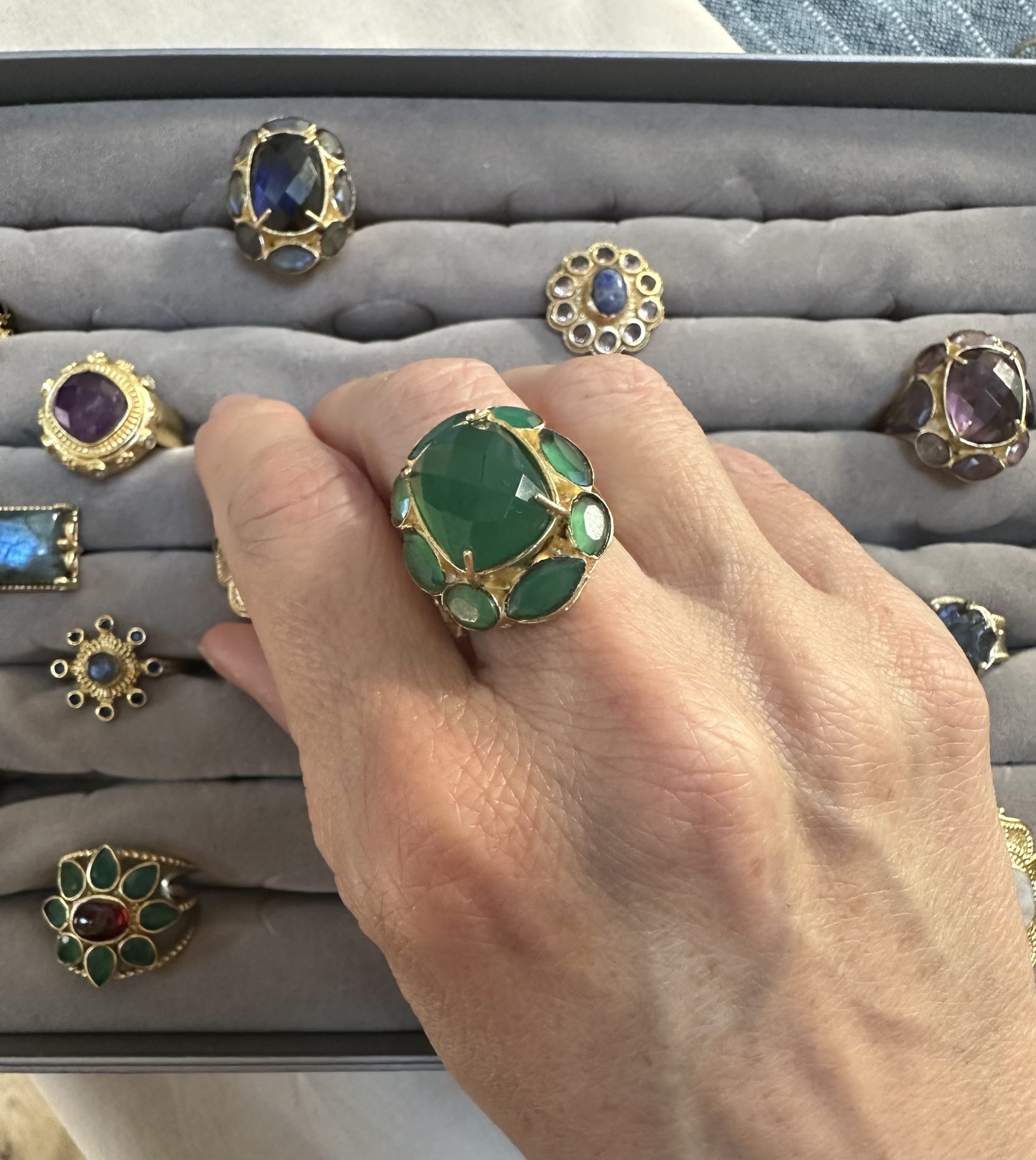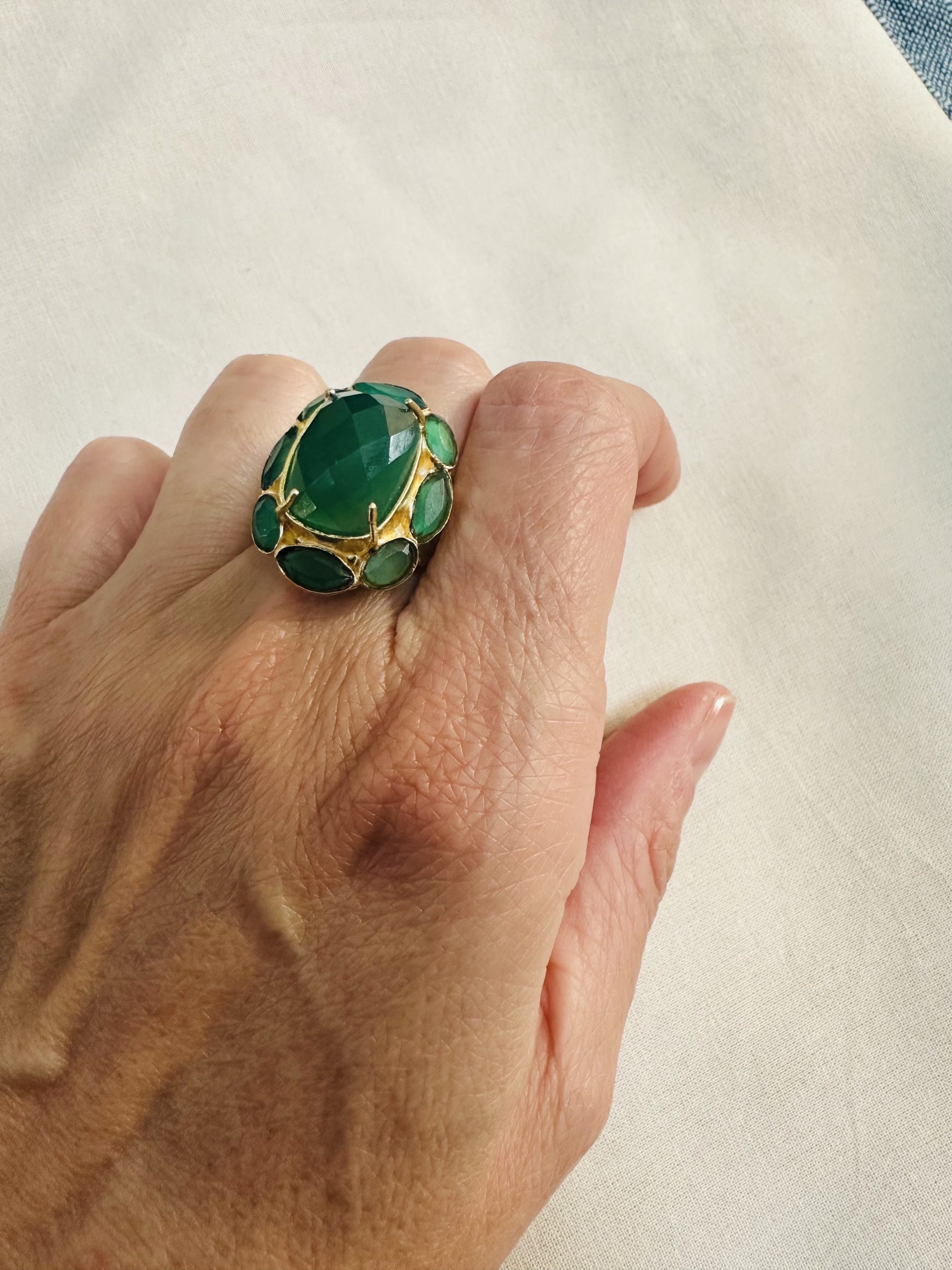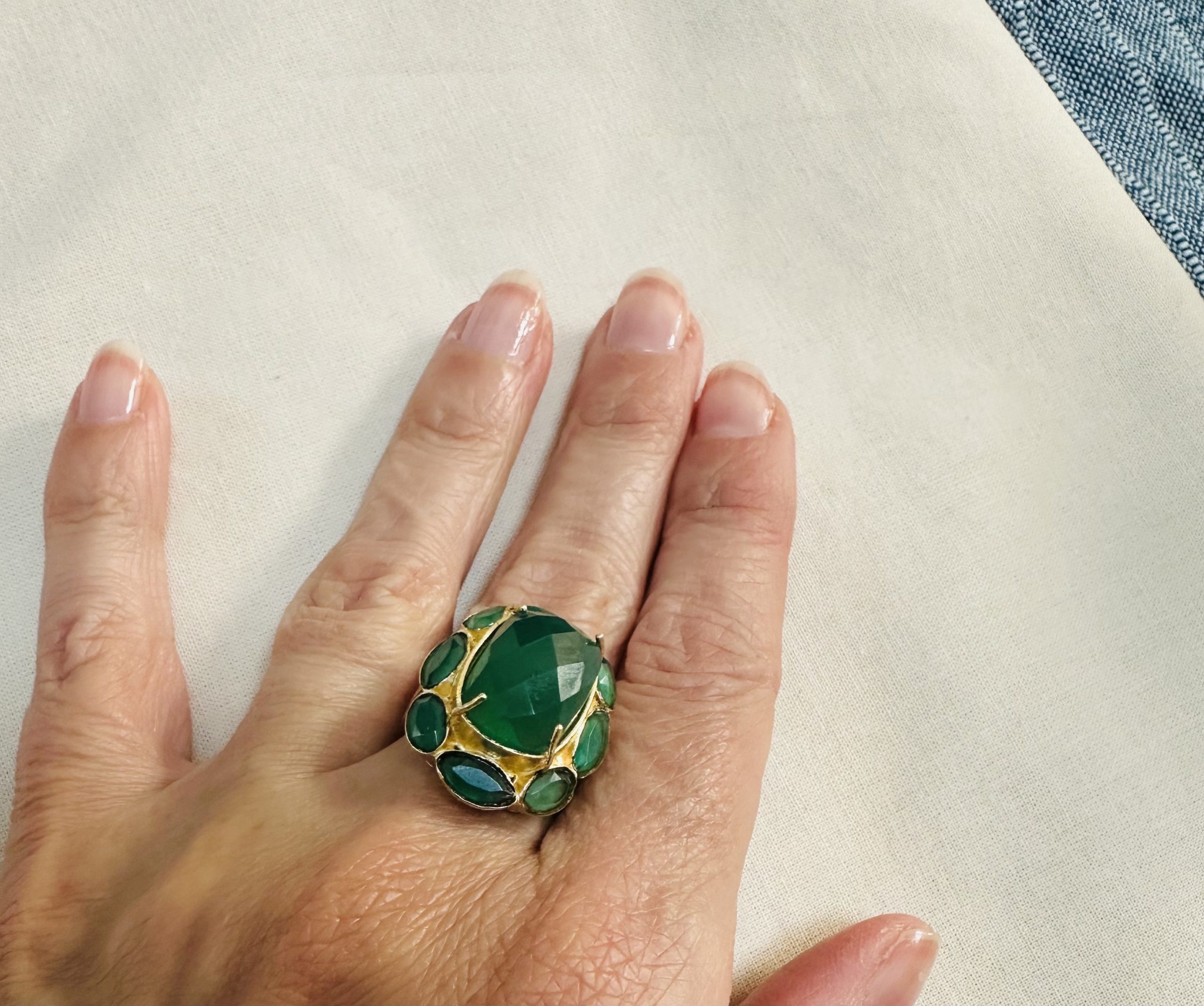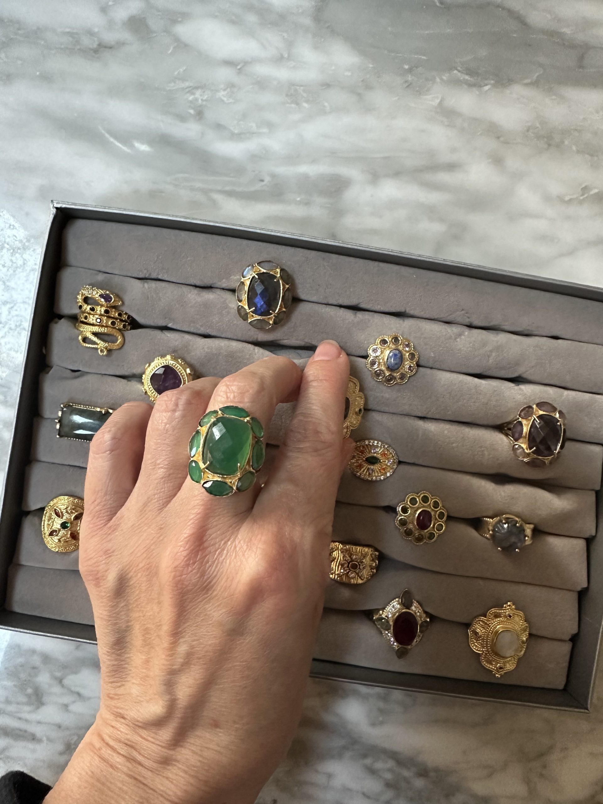 Une bague qui porte en elle le souffle des sommets. Le cabochon ovale d’onyx vert — profond, mat, d’un vert forêt intense — repose dans une monture en laiton doré comme une pierre sacrée enchâssée dans un temple. Pierre de force tranquille et d’équilibre, elle évoque les vallées verdoyantes du Népal, entre ciel et terre, entre le bruit du monde et le silence intérieur.