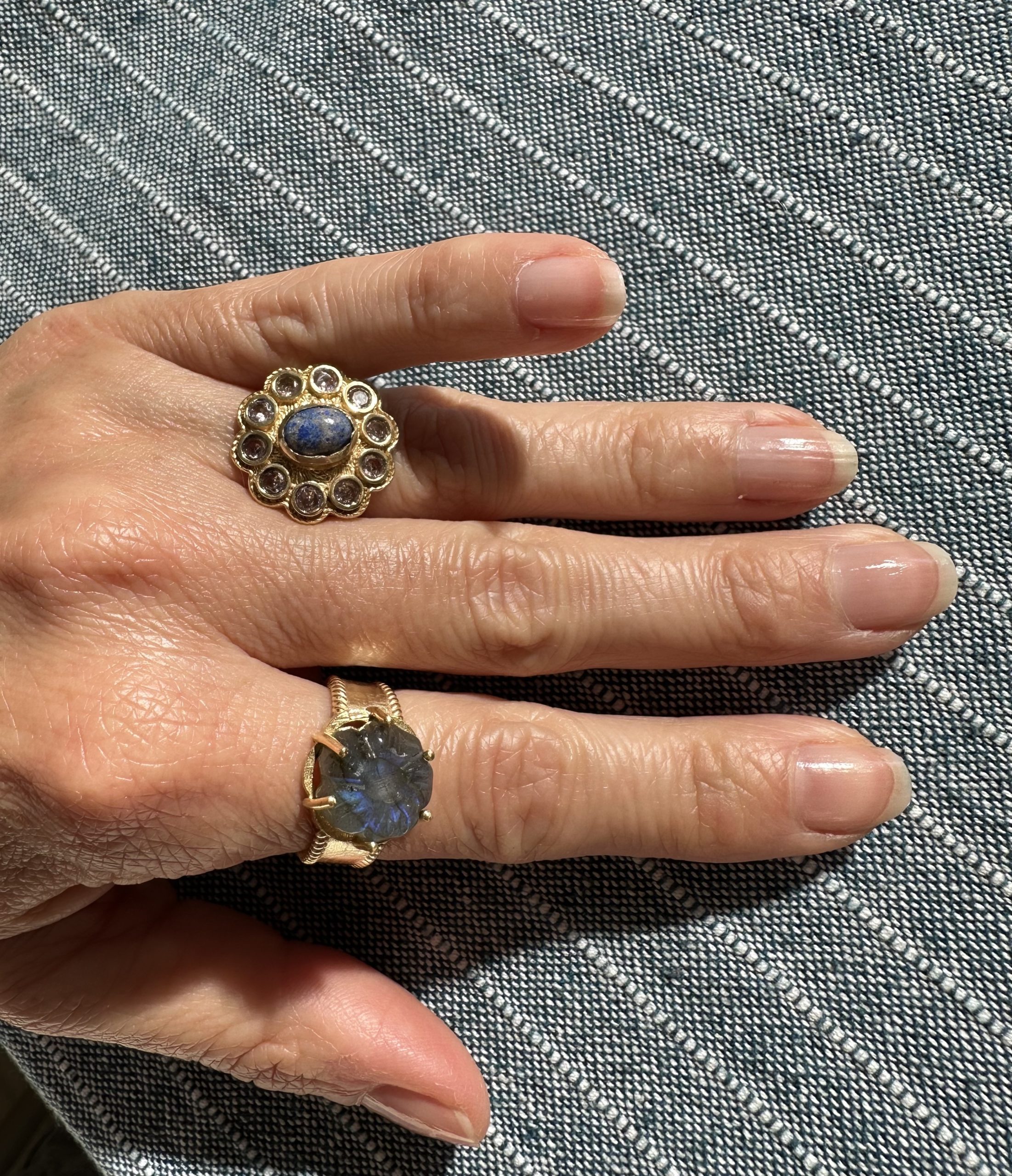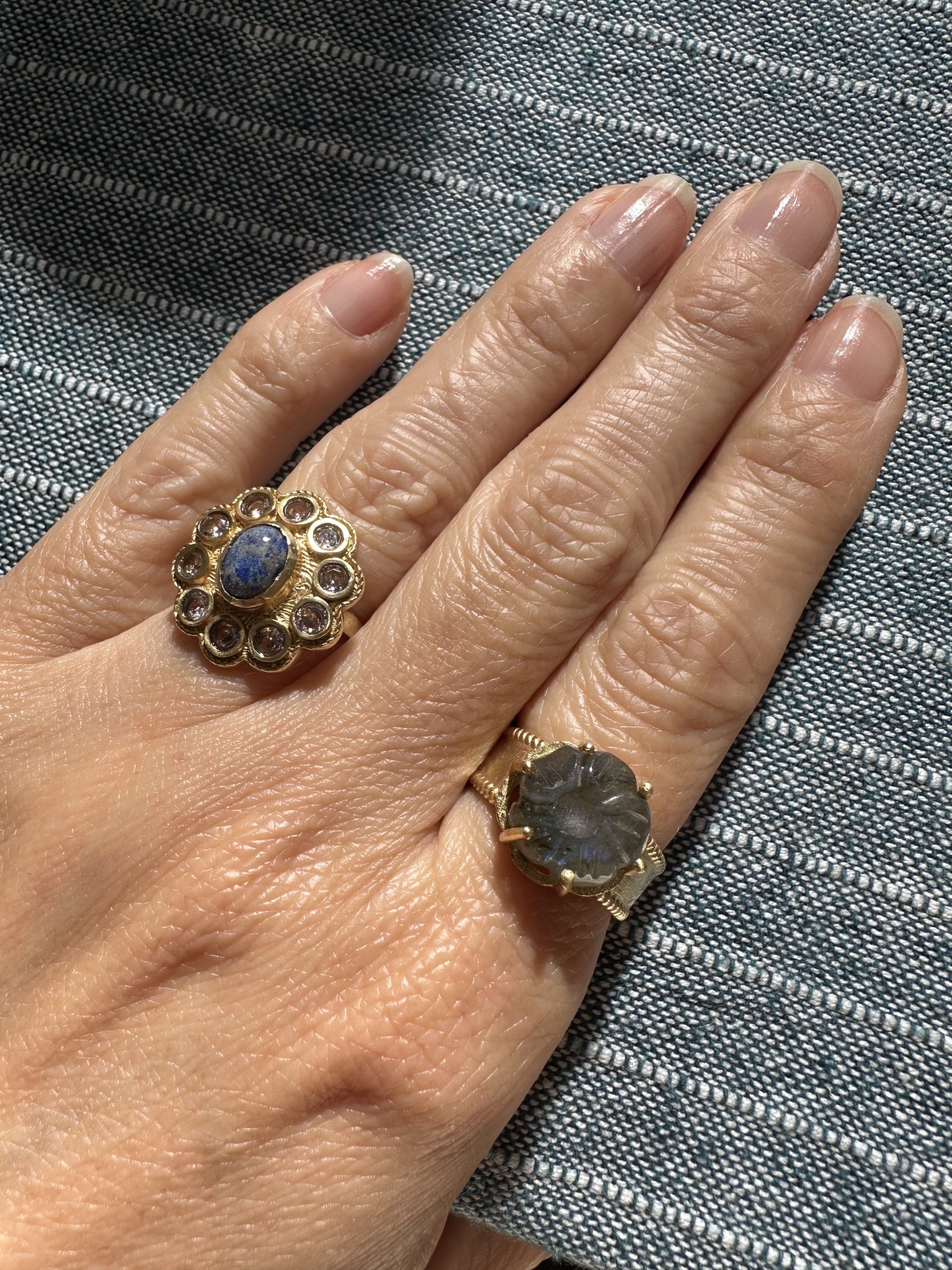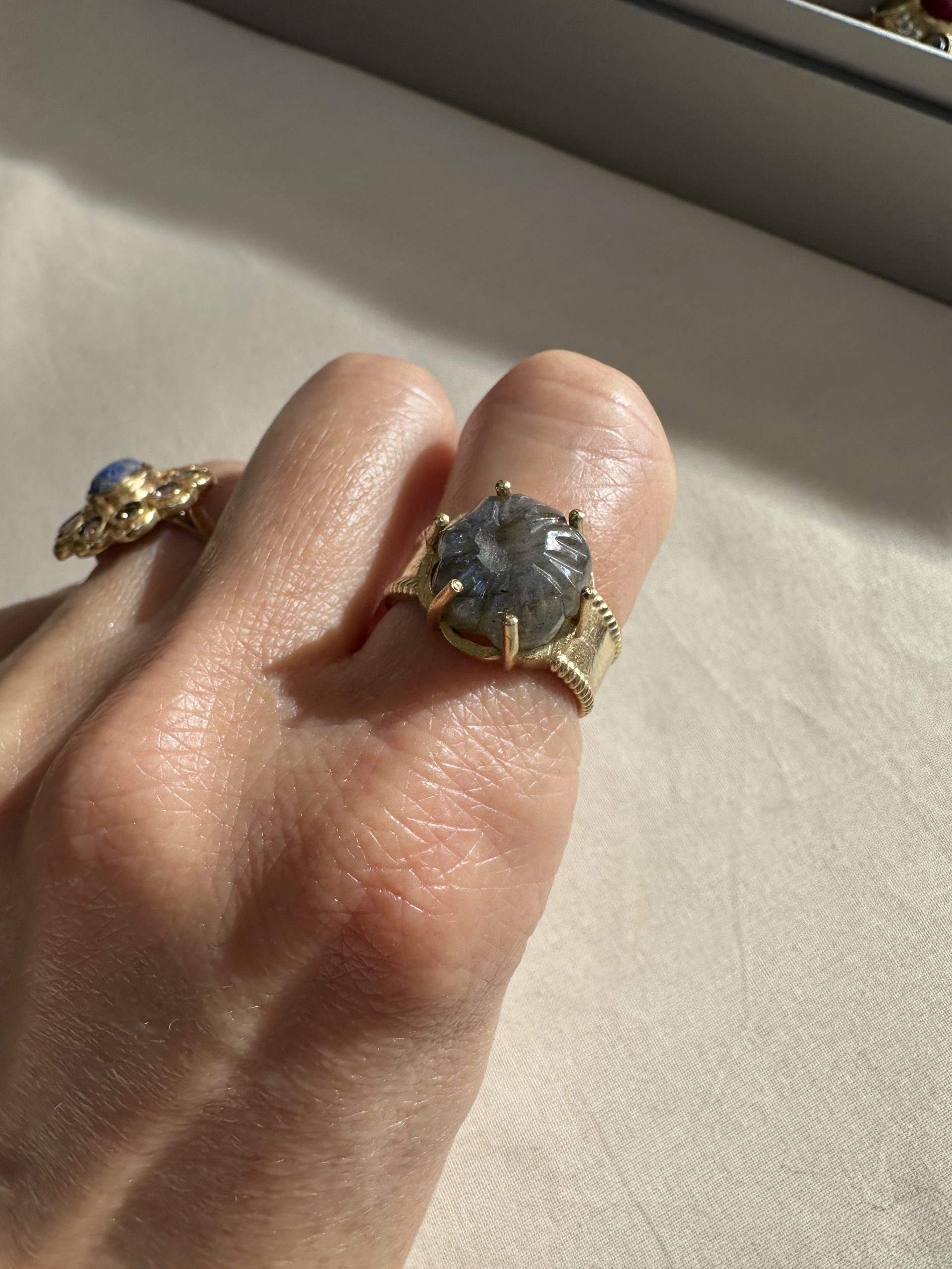 Une fleur née au sommet du monde. Sculptée dans une labradorite aux reflets changeants — bleus, verts, dorés selon la lumière — cette fleur repose dans une monture couronne à griffes dorées en laiton doré, comme offerte au ciel. Pierre de transformation et d’intuition, la labradorite capte la lumière et la restitue à sa façon, mystérieuse et souveraine. Une bague qui s’impose avec grâce, comme les palais de Lhassa sur fond d’Himalaya.