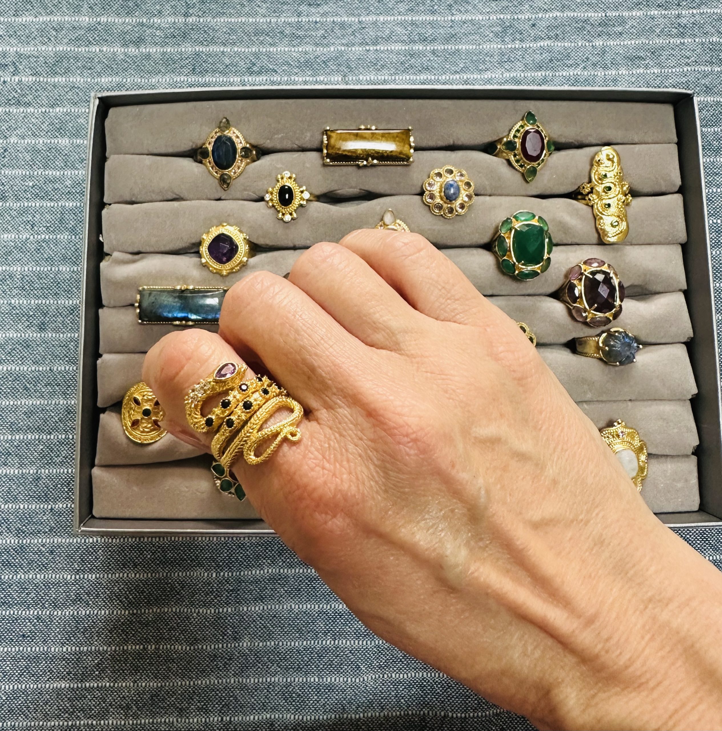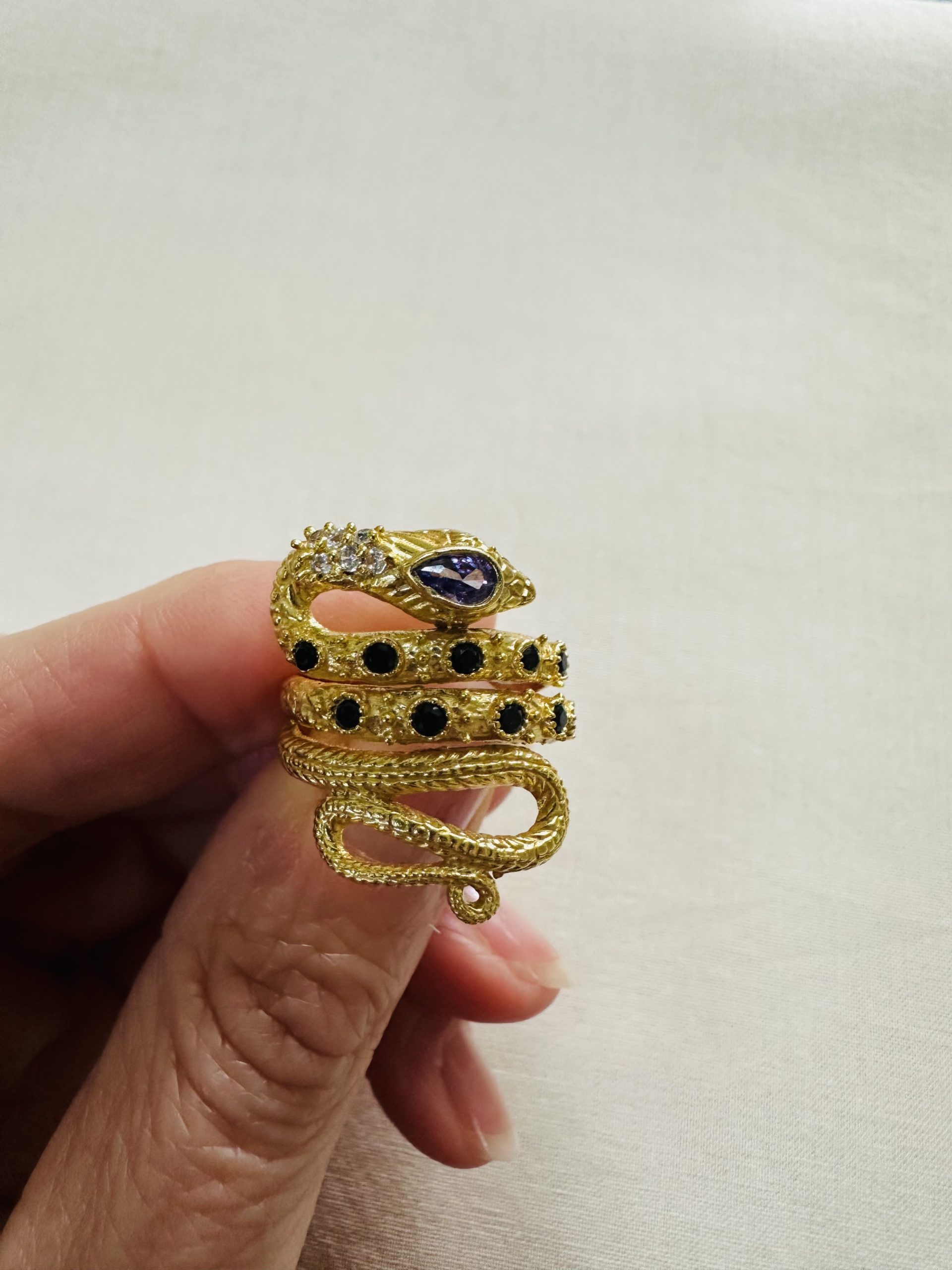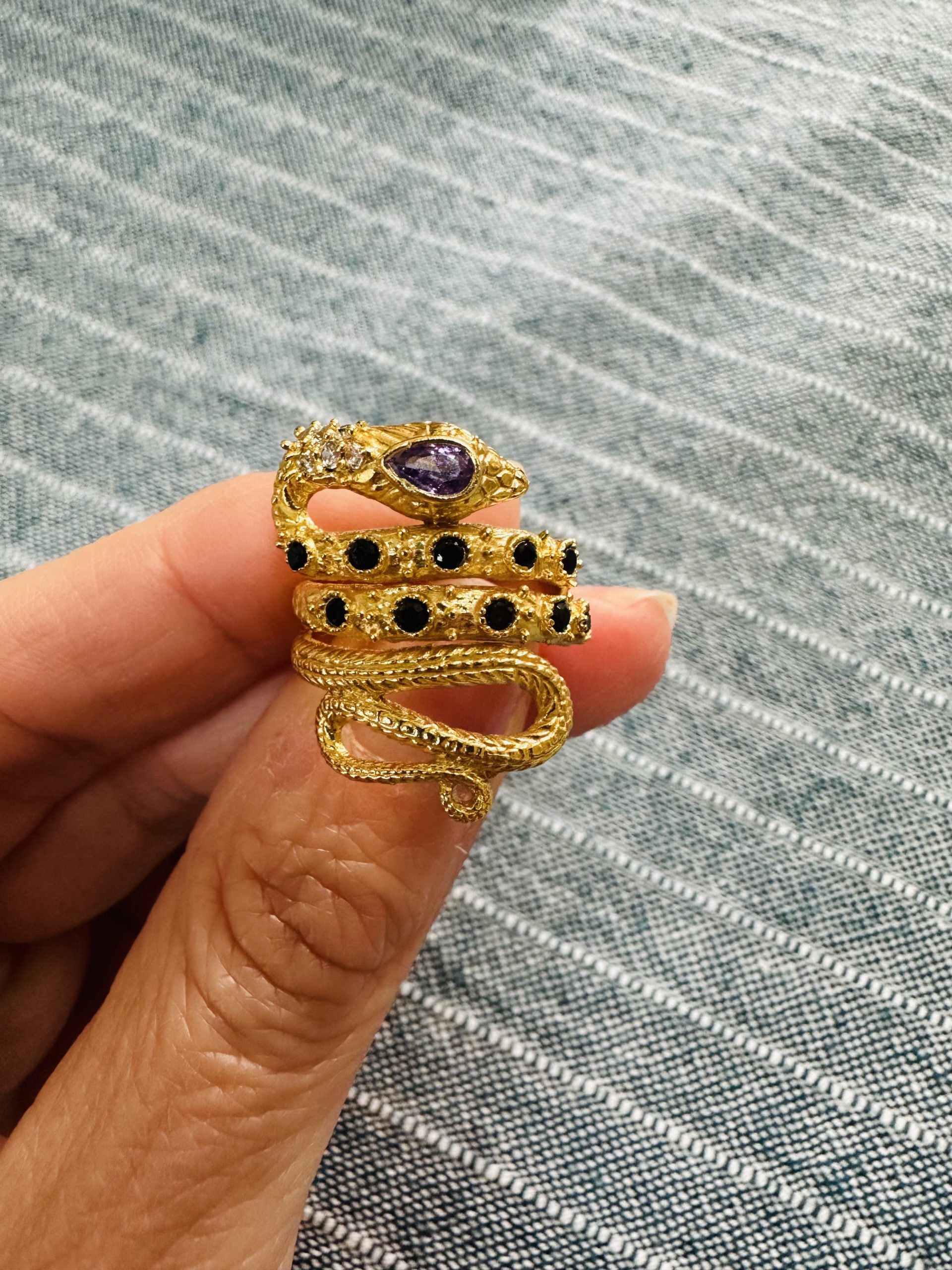 Un serpent d’or s’enroule autour du doigt, gardien silencieux d’une améthyste ovale aux reflets violets profonds. Le long de ses écailles finement travaillées, des éclats de quartz fumé et des zircons scintillent comme autant d’étoiles dans la nuit du Rajasthan. Pièce unique, façonnée à la main par les artisans de Jaipur — la ville rose, capitale des pierres précieuses.
