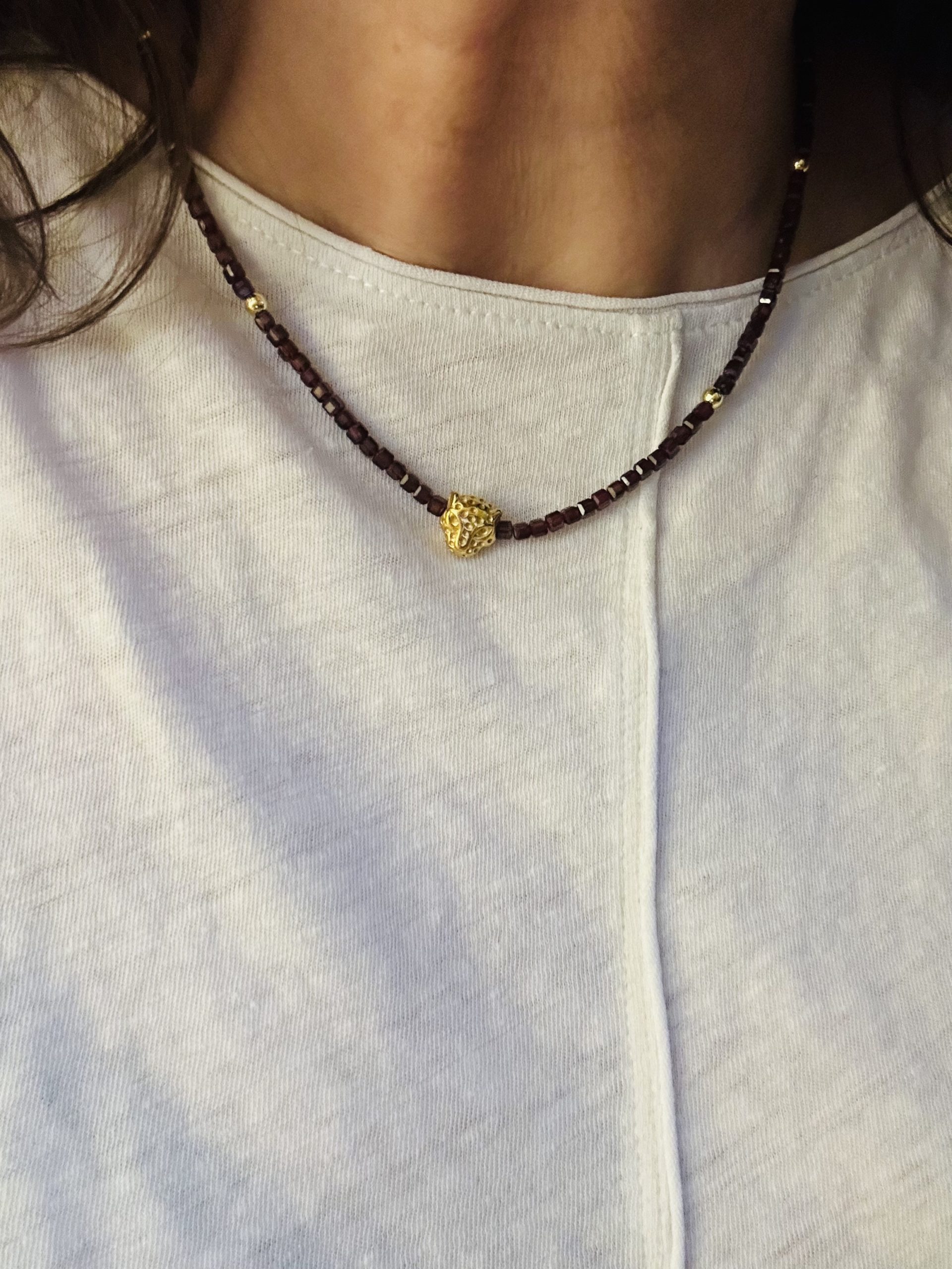 Le collier COLOMBO est composé de perles cube en grenat almandin, séparées par des perles dorées en plaqué or, pour un rendu chic et puissant. En son centre, un pendentif léopard apporte une touche audacieuse et moderne.