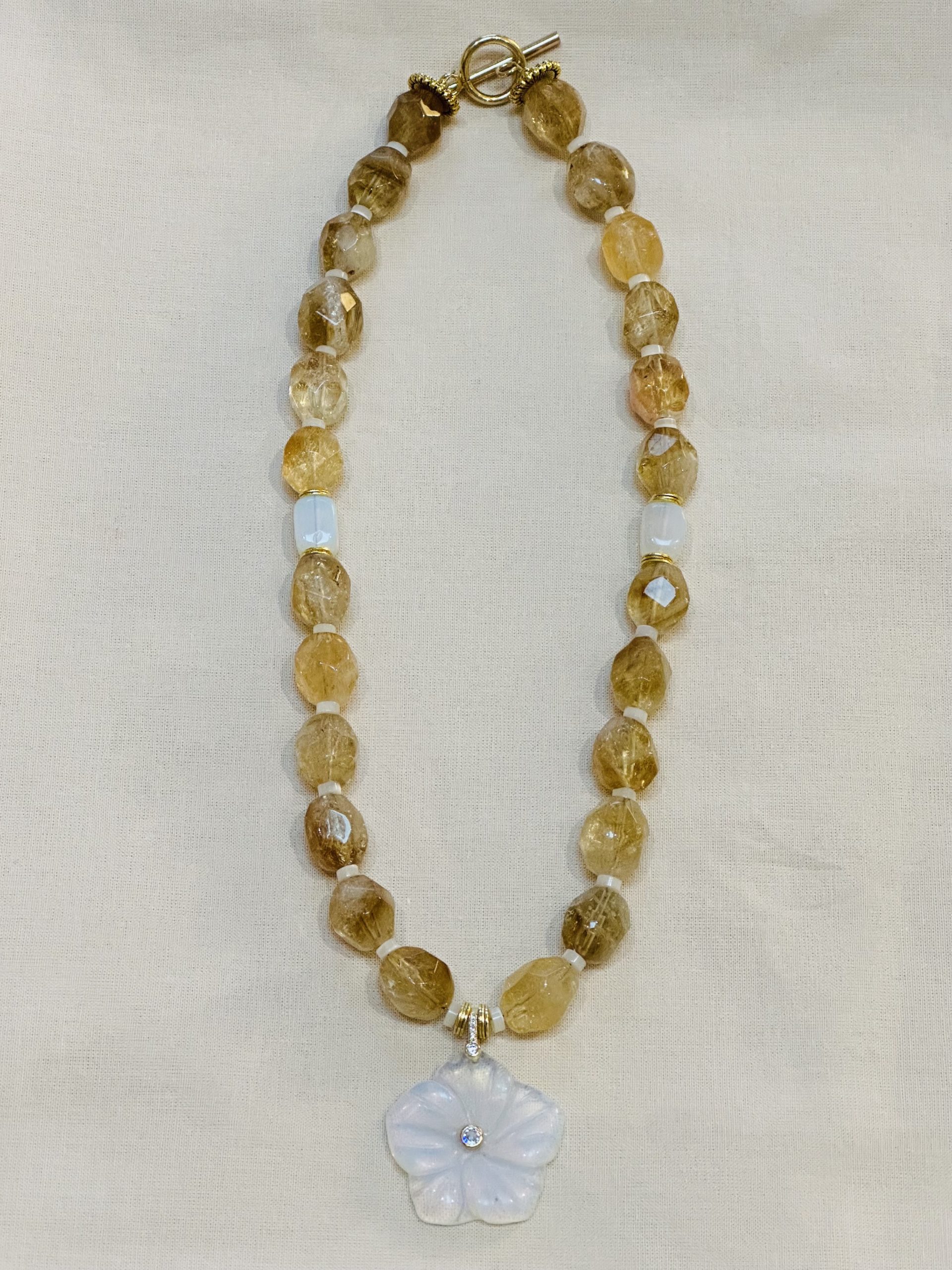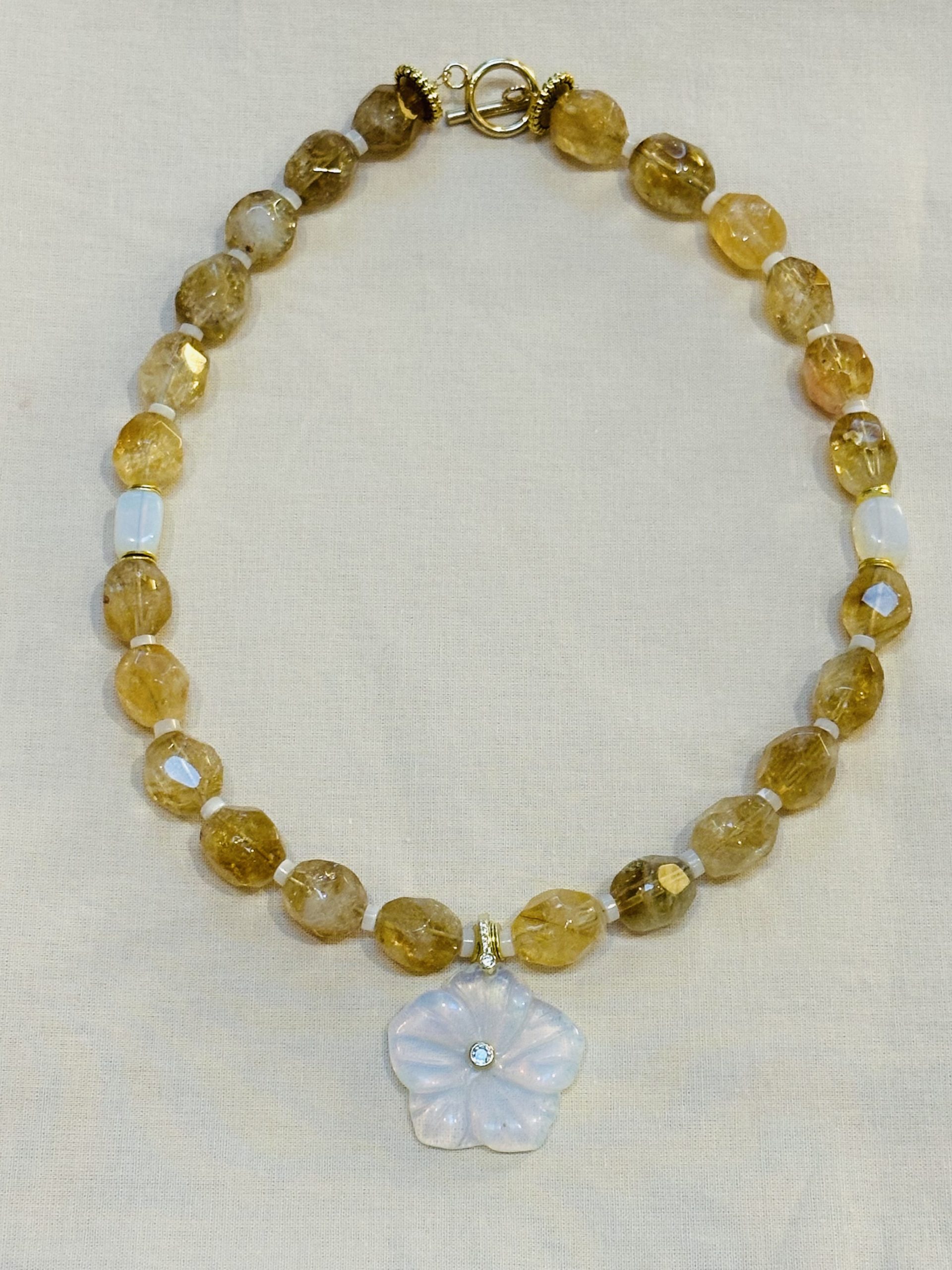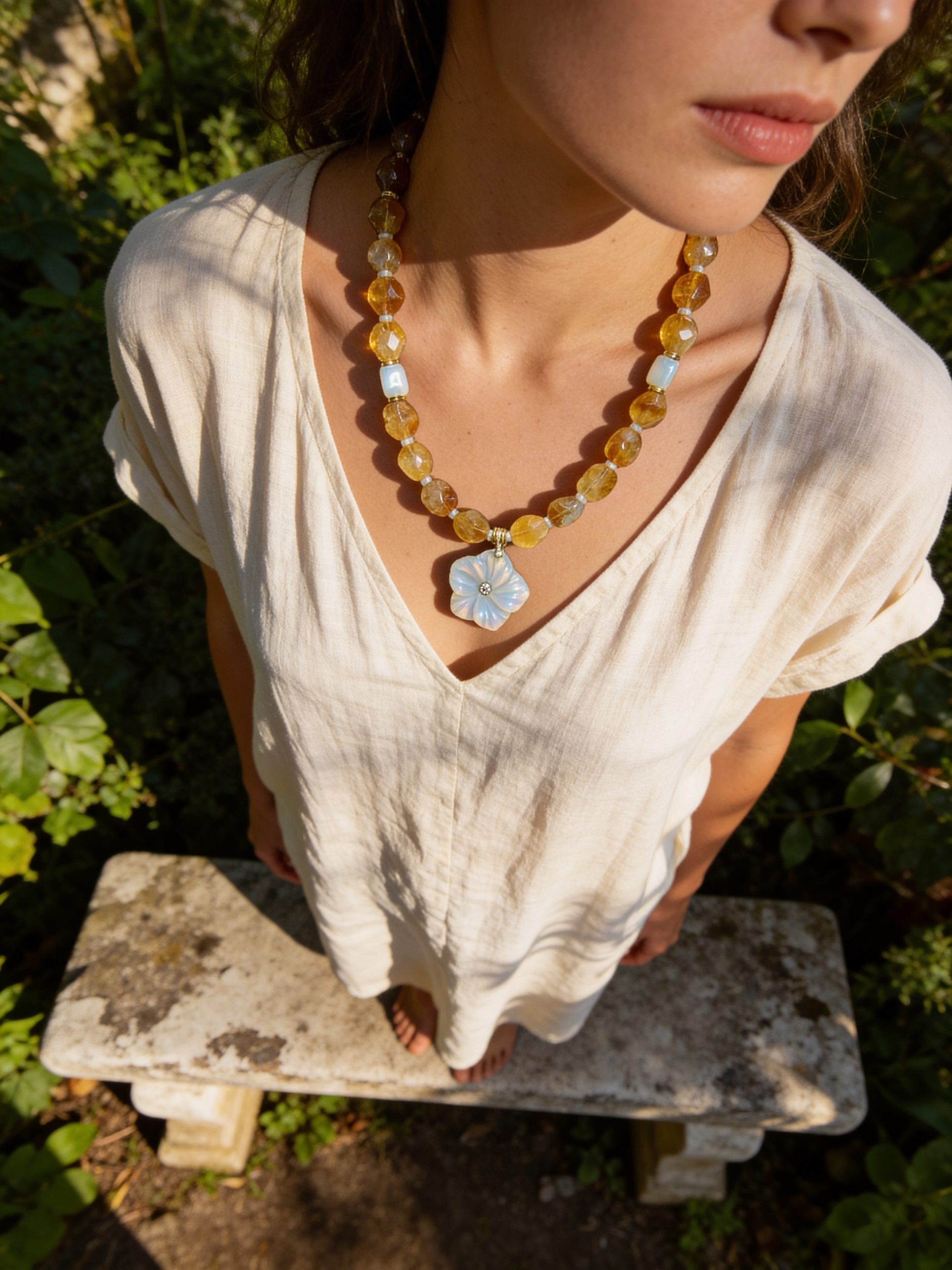 Il est composé de perles facettées en citrine, aux reflets dorés et solaires, séparées de délicates petites perles en nacre et de deux perles en opalite, apportant douceur et harmonie à l’ensemble.