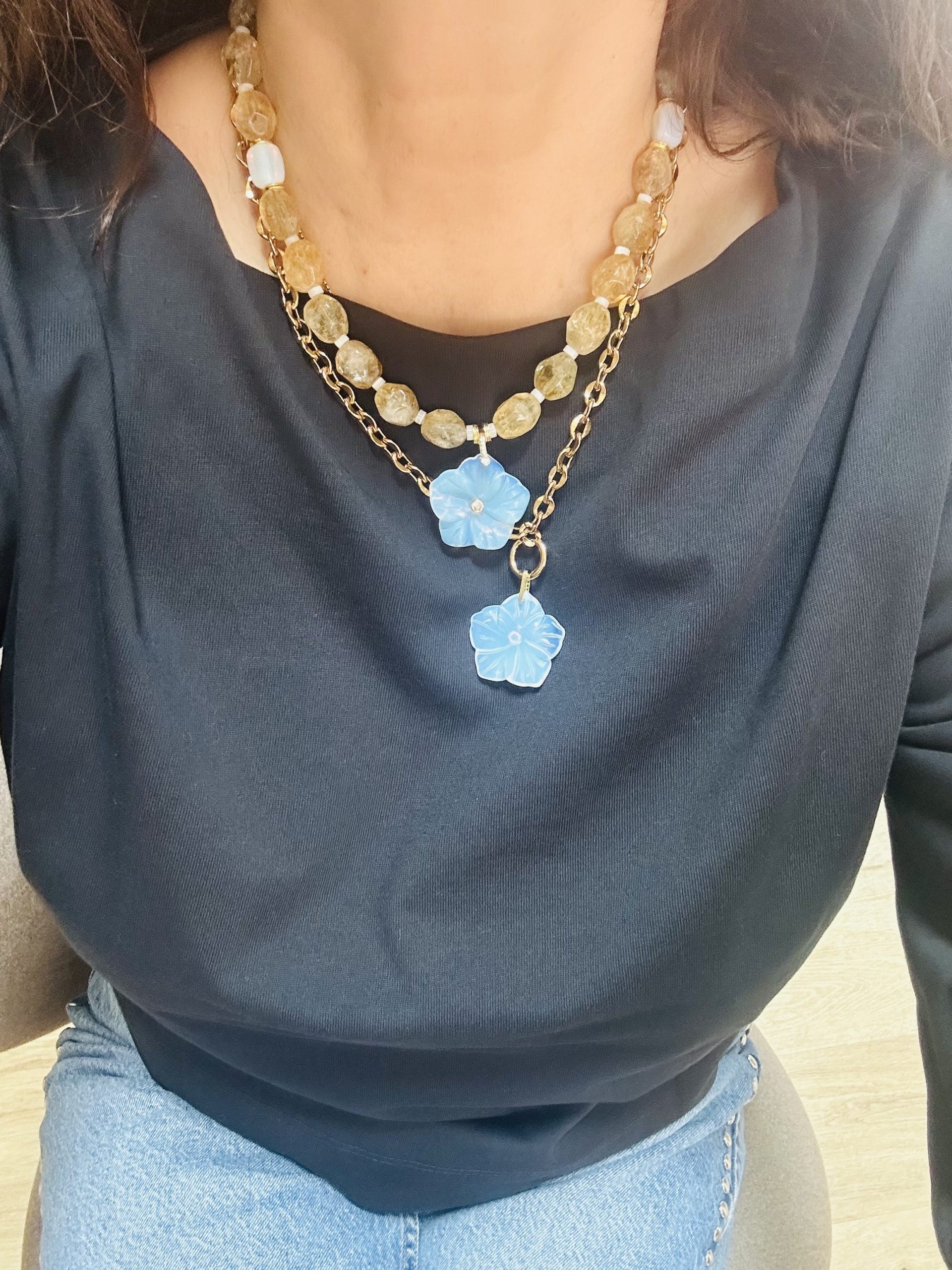 Le collier KANDY est composé de perles facettées en citrine, séparées de petites perles en nacre et de deux perles en opalite, pour un rendu délicat et lumineux. En son centre, un pendentif fleur en opalite serti d’un zircon apporte une touche précieuse et raffinée.