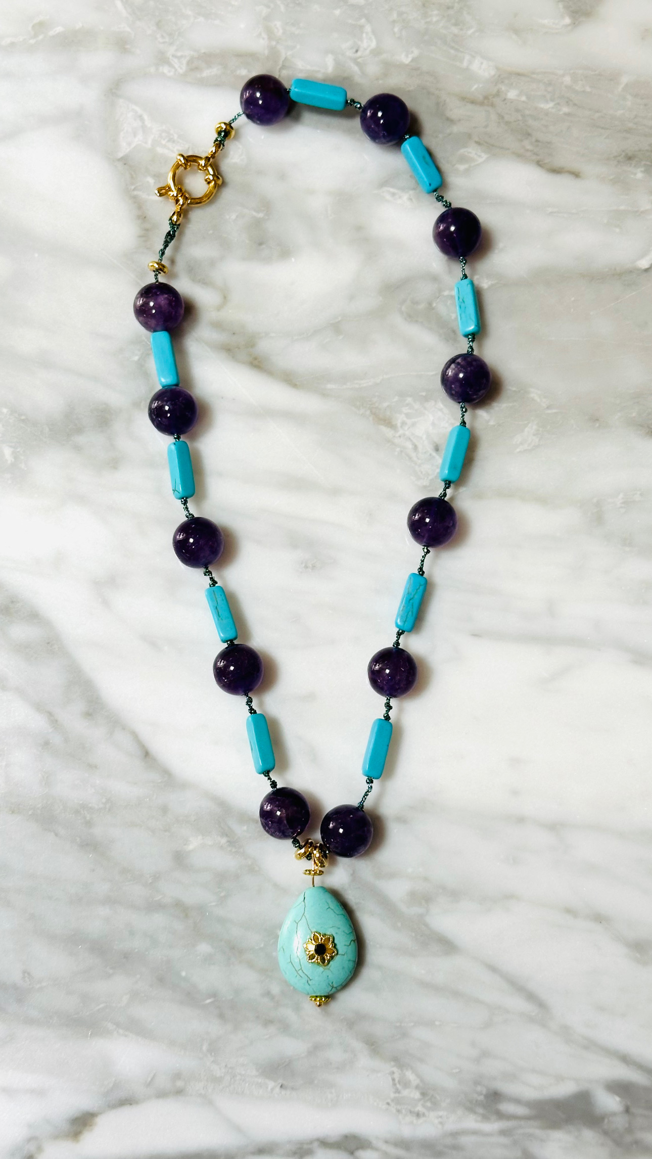 En pièce centrale, un pendentif en howlite turquoise taillé en goutte, serti d’un alliage plaqué or, et d’une pierre fine facettée en cristal noir vient poser un contraste délicat entre le violet profond de l’améthyste et le bleu-vert lumineux de la howlite.
