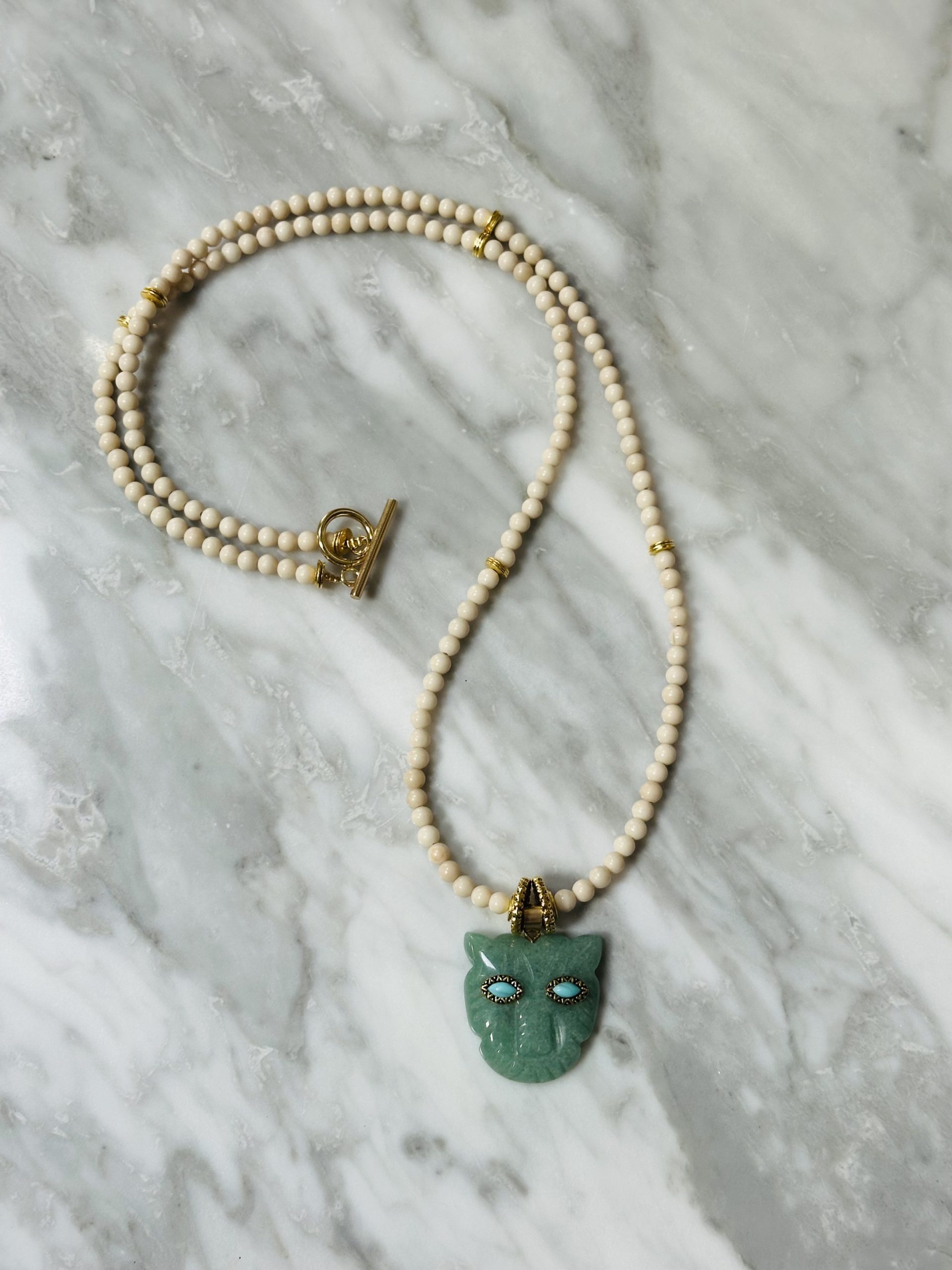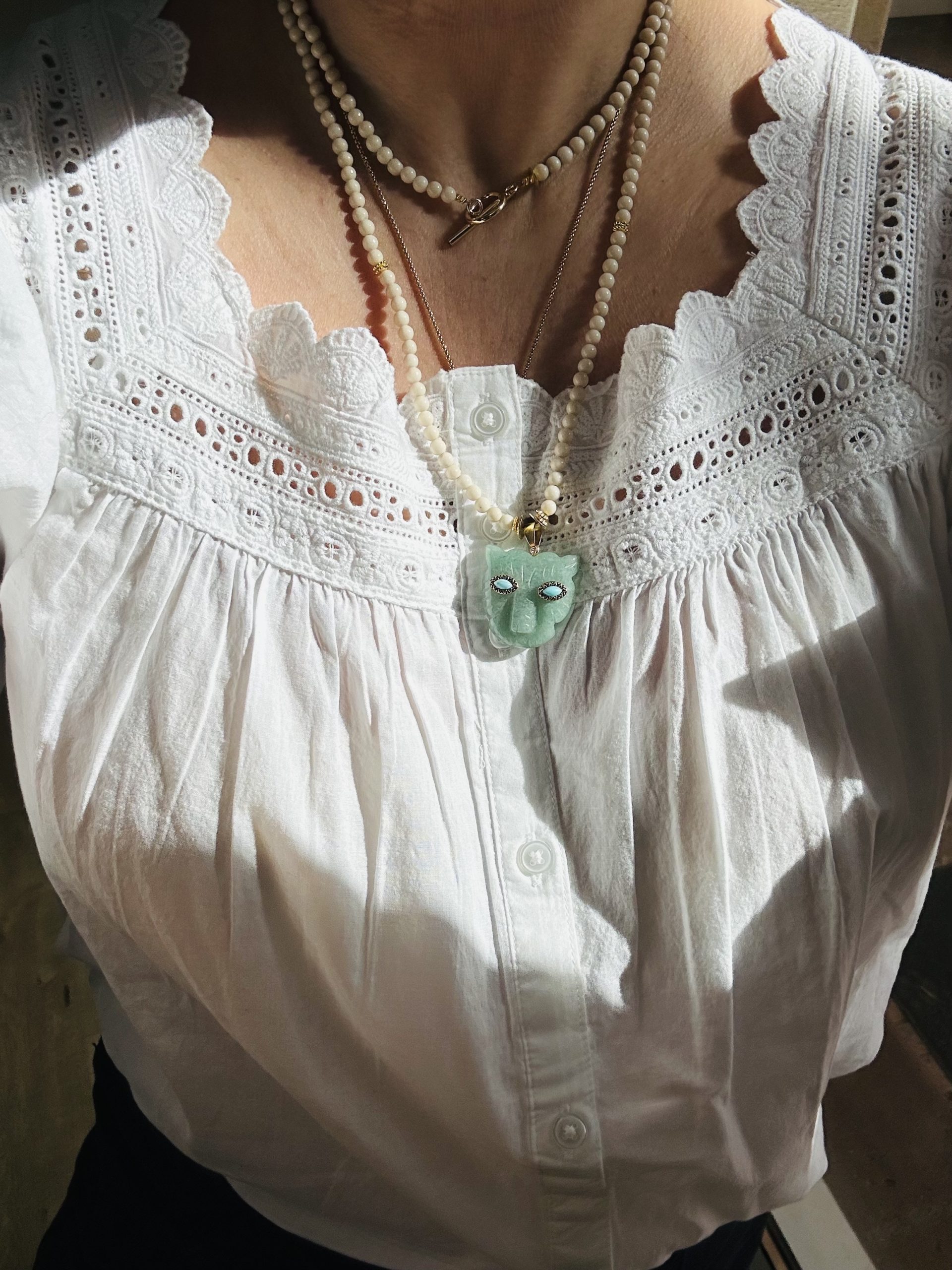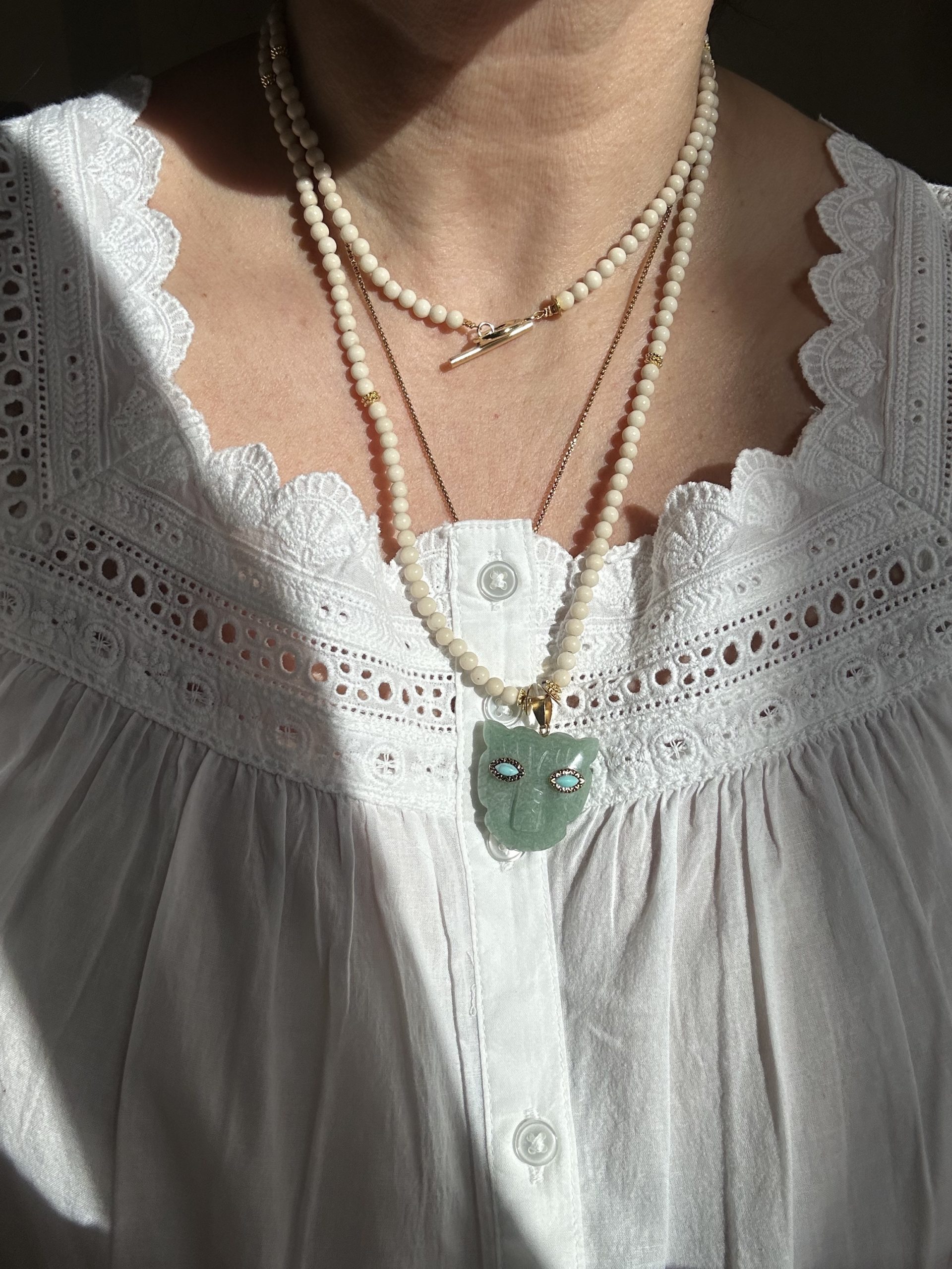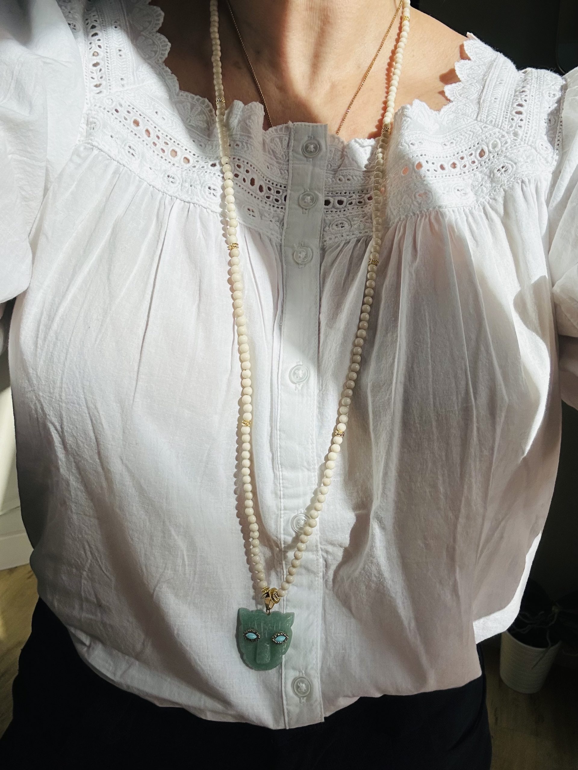 La liberté de le porter à ta façon. Le collier Lima est un collier généreux, pensé pour celles qui aiment les bijoux qui ont du caractère et de la présence. Ses perles de River Stone aux teintes naturelles — du blanc nacré au beige doux — se succèdent avec grâce, séparées par de délicates touches plaquées or qui viennent illuminer l’ensemble sans l’alourdir. En son centre trône une lionne sculptée en aventurine, verte et lumineuse — symbole d’une féminité à la fois douce et souveraine.