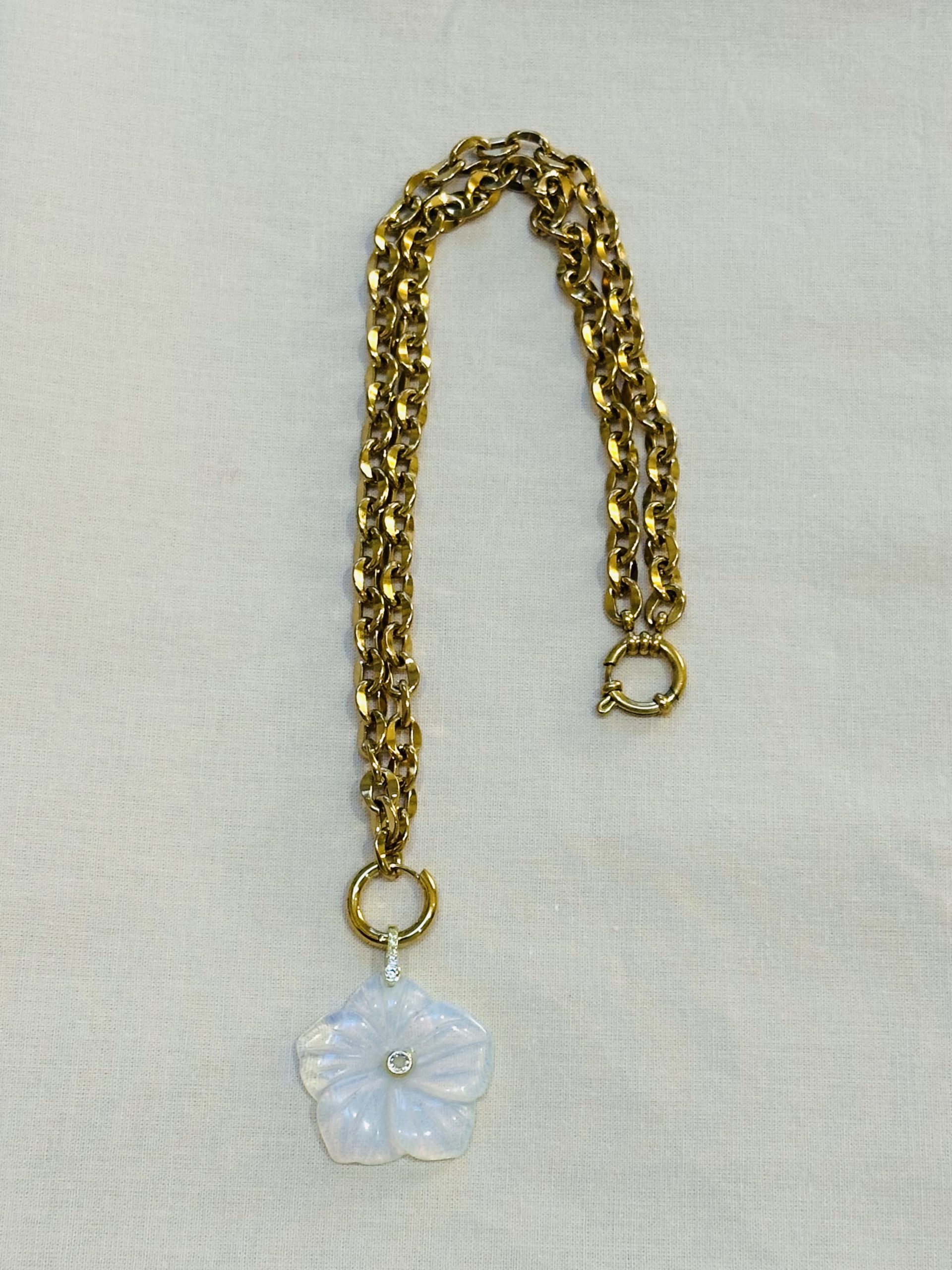 En son centre, un délicat pendentif fleur en opalite, serti d’un zircon, capte la lumière avec élégance. Symbole de douceur et d’harmonie, cette pièce apporte une touche féminine et lumineuse à l’ensemble.