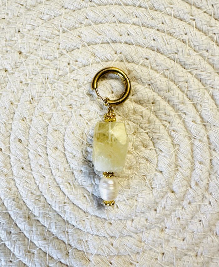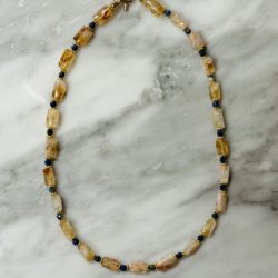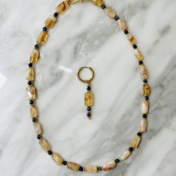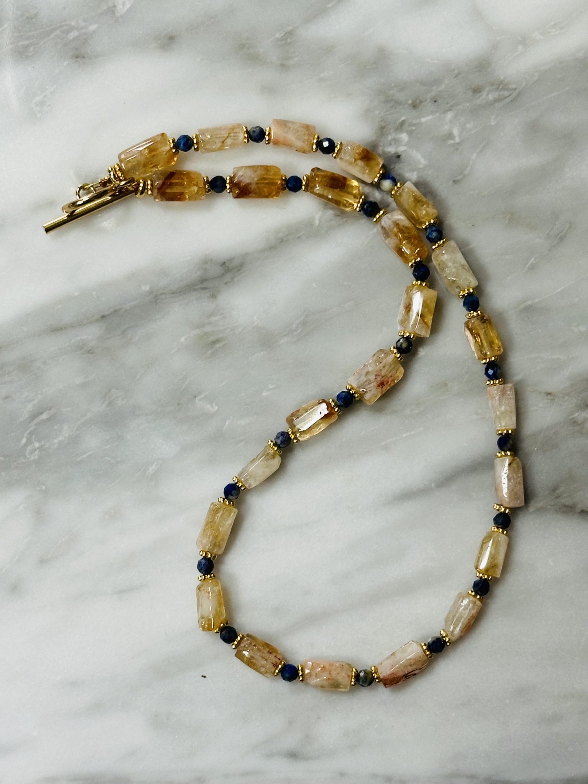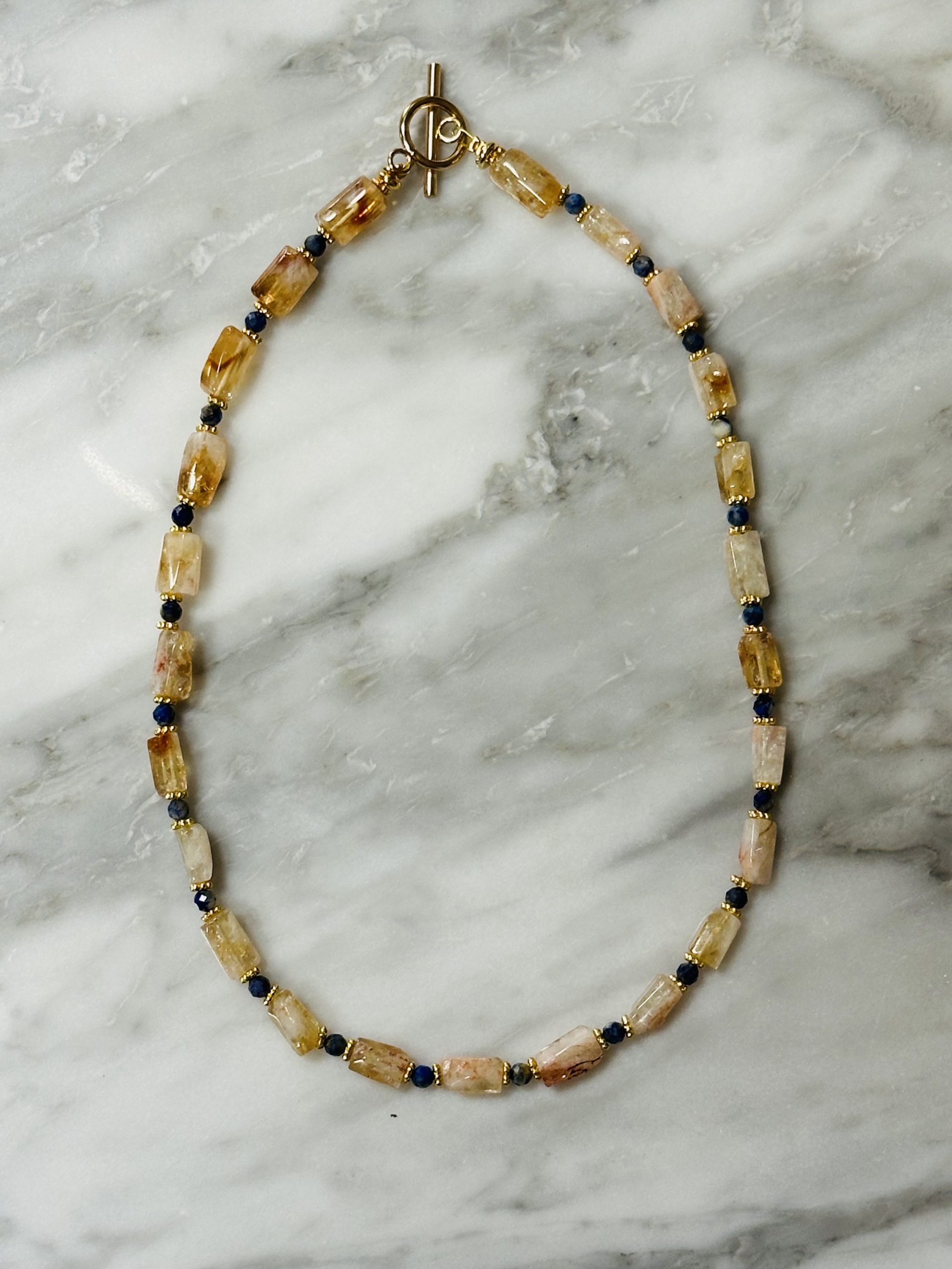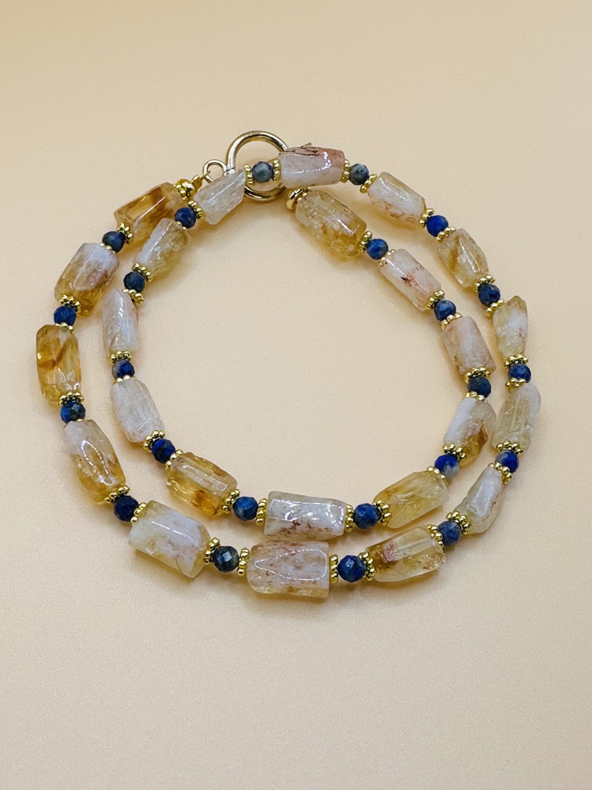 Les perles tubes de Citrine et les perles facettées de Lapis sont délicatement séparées par des apprêts en plaqué or, et son fermoir T doré ajoute une touche de modernité et d’élégance.