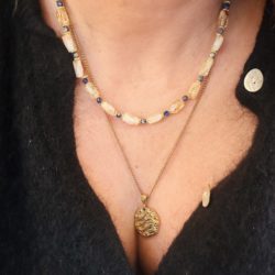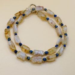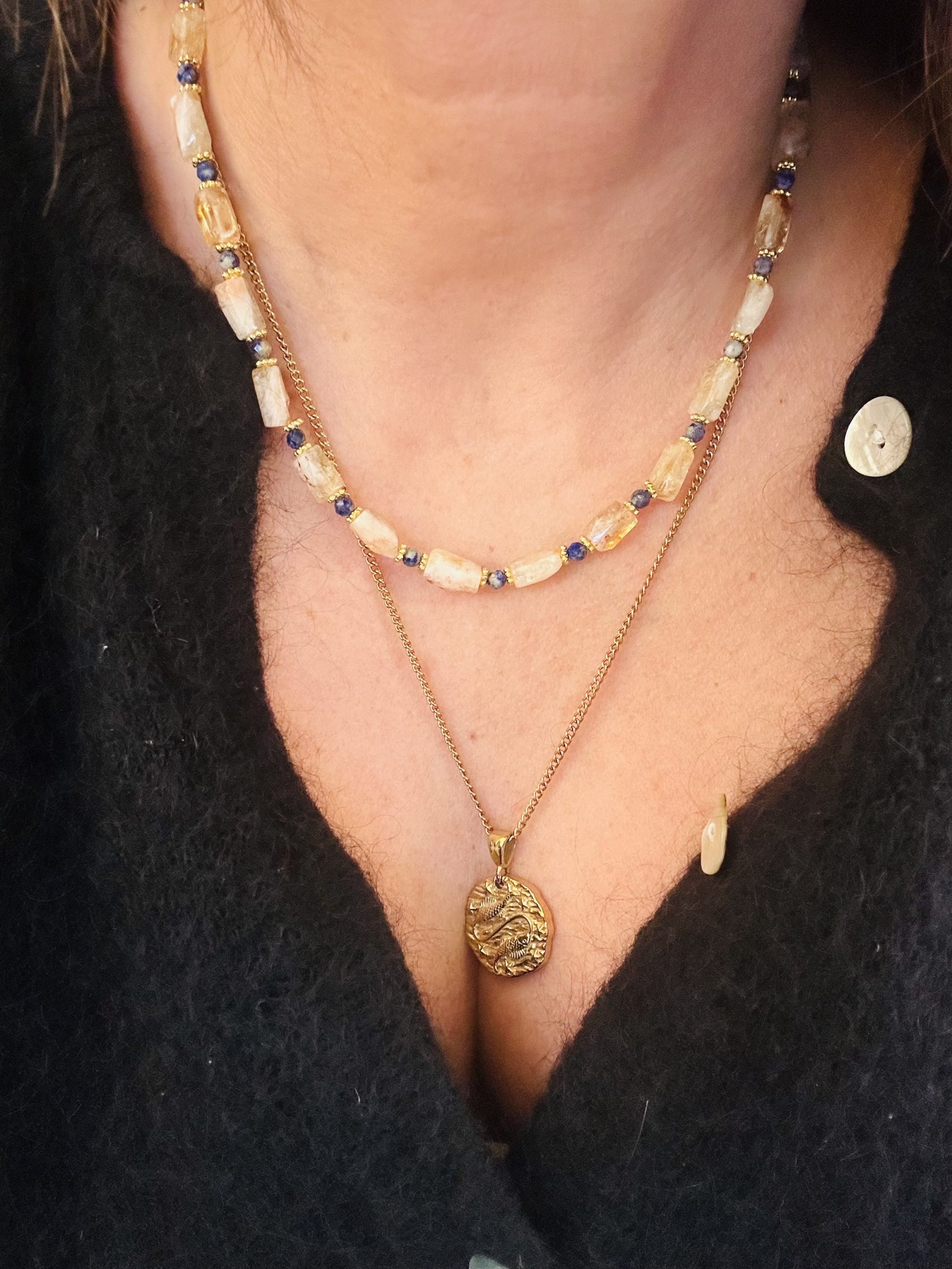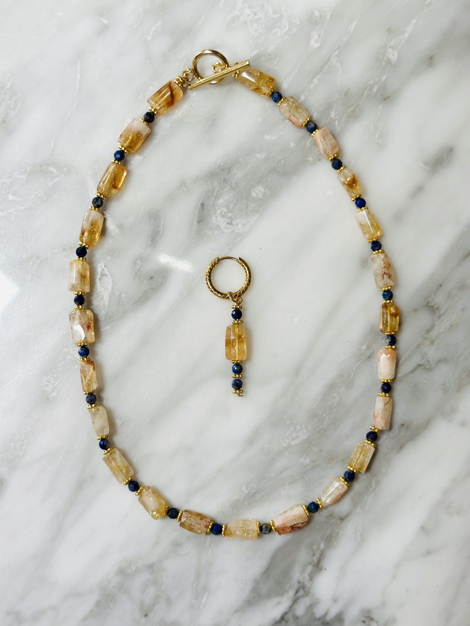 Le collier Madère est un bijoux entièrement imaginé et monté à la main, où la lumière dorée de la Citrine rencontre la profondeur vibrante du Lapis Lazuli.