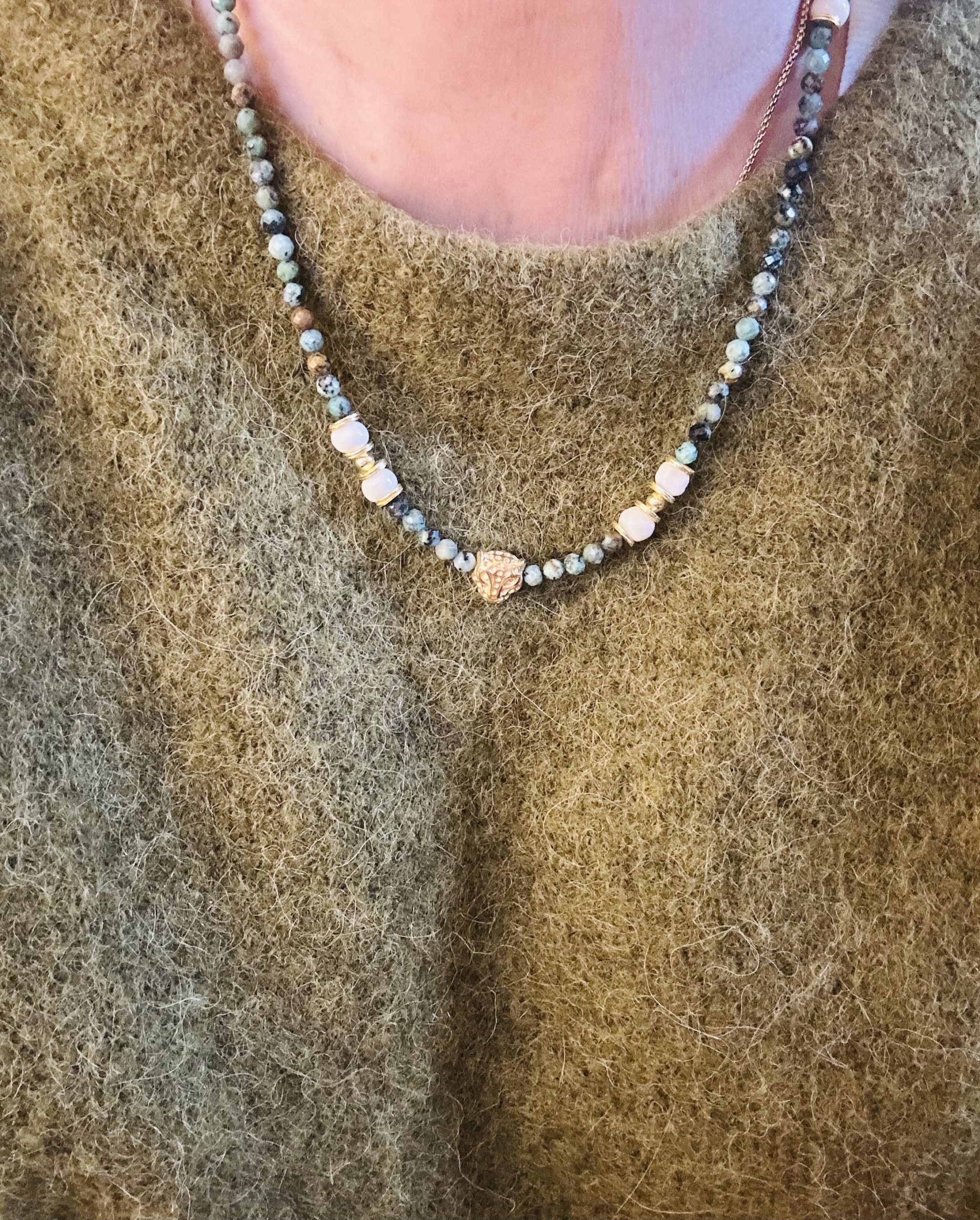 Mumbai, c’est un collier qui porte une énergie à part. Inspiré des bazars colorés et des matières brutes du monde, il réunit des perles facettées de turquoise africaine — avec leurs nuances de bleu-vert profondes et leur éclat naturel — et de douces perles River Stone aux teintes claires et apaisantes.