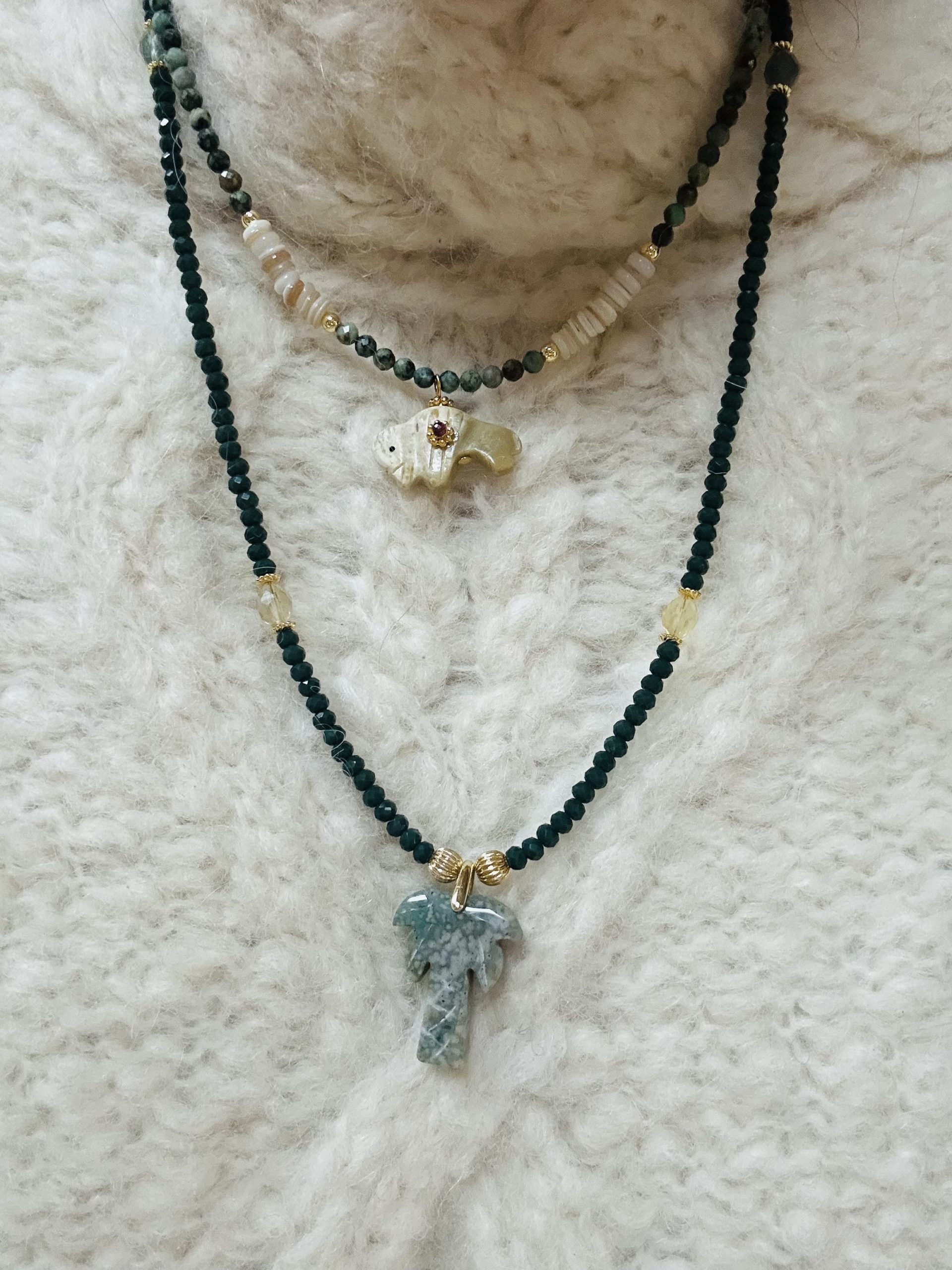 Au centre du collier, un palmier en jaspe océan attire le regard. Pierre d’ancrage et de sérénité, le jaspe océan est associé au lâcher-prise, à la douceur et au lien profond avec la nature et les cycles de la vie. Le palmier, symbole de force et de liberté, renforce cette énergie protectrice et apaisante.