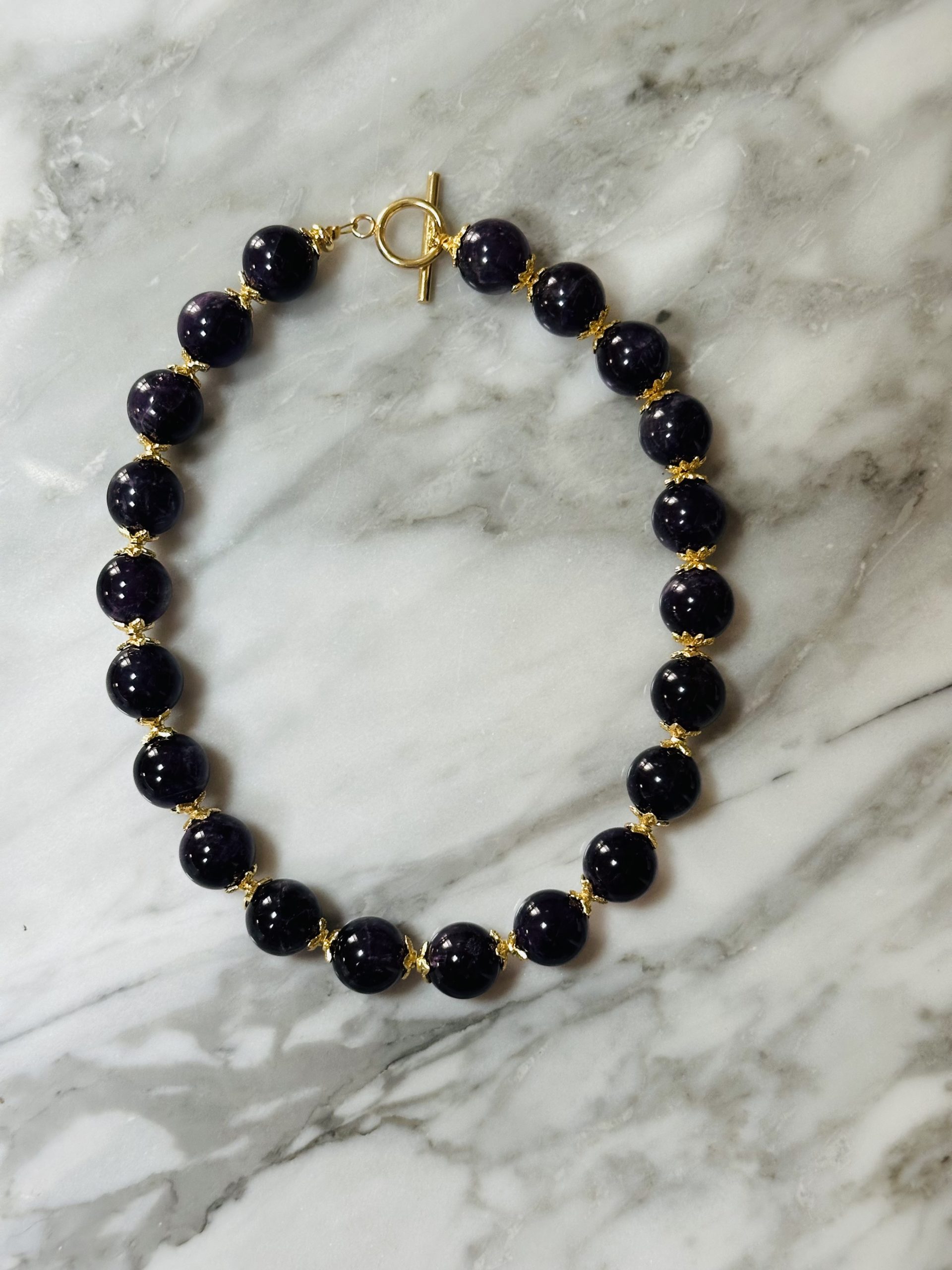 Le collier Purple est un bijou créé à la main qui met en lumière la beauté intense de grosses perles d’Améthyste à la couleur profonde et envoûtante.