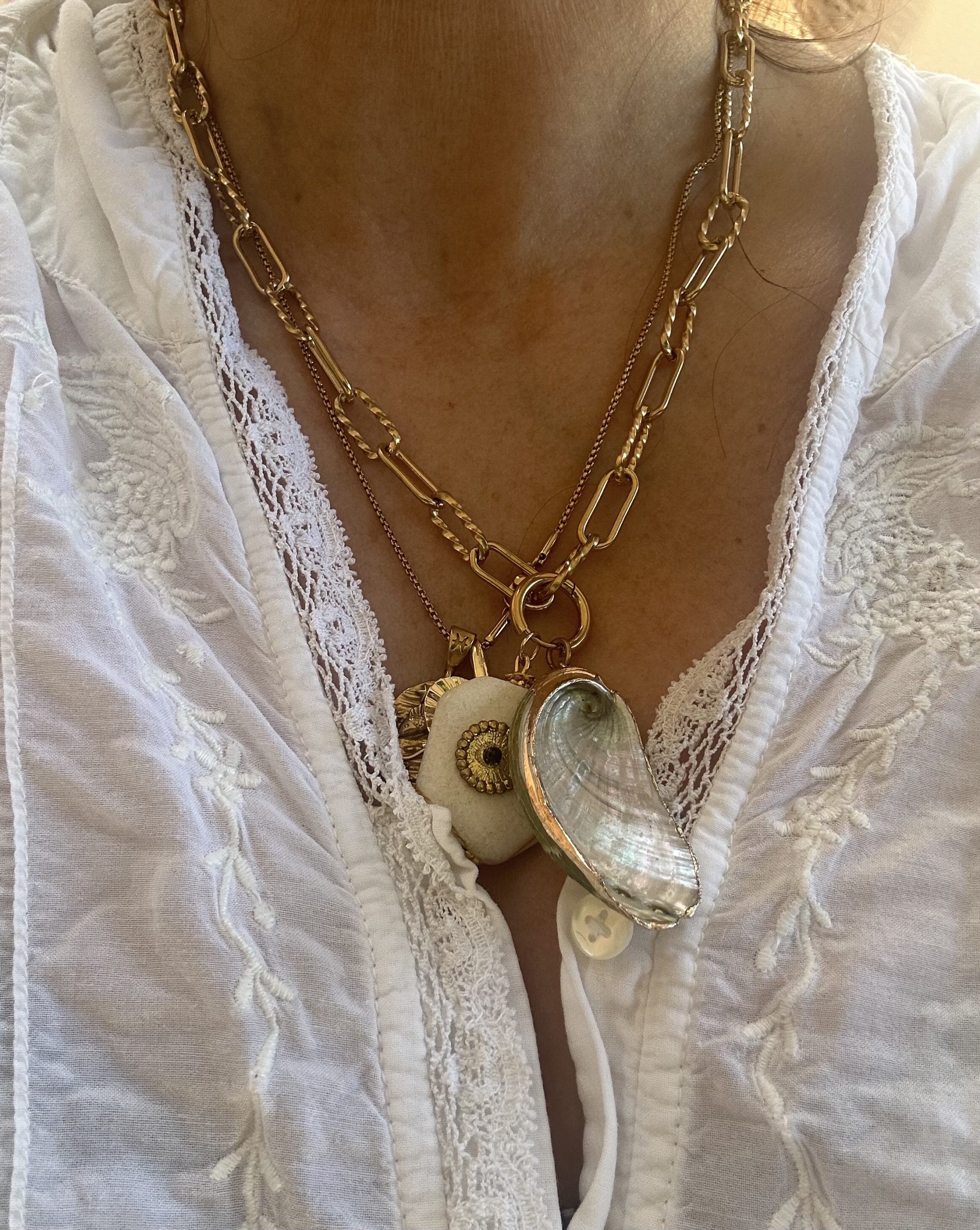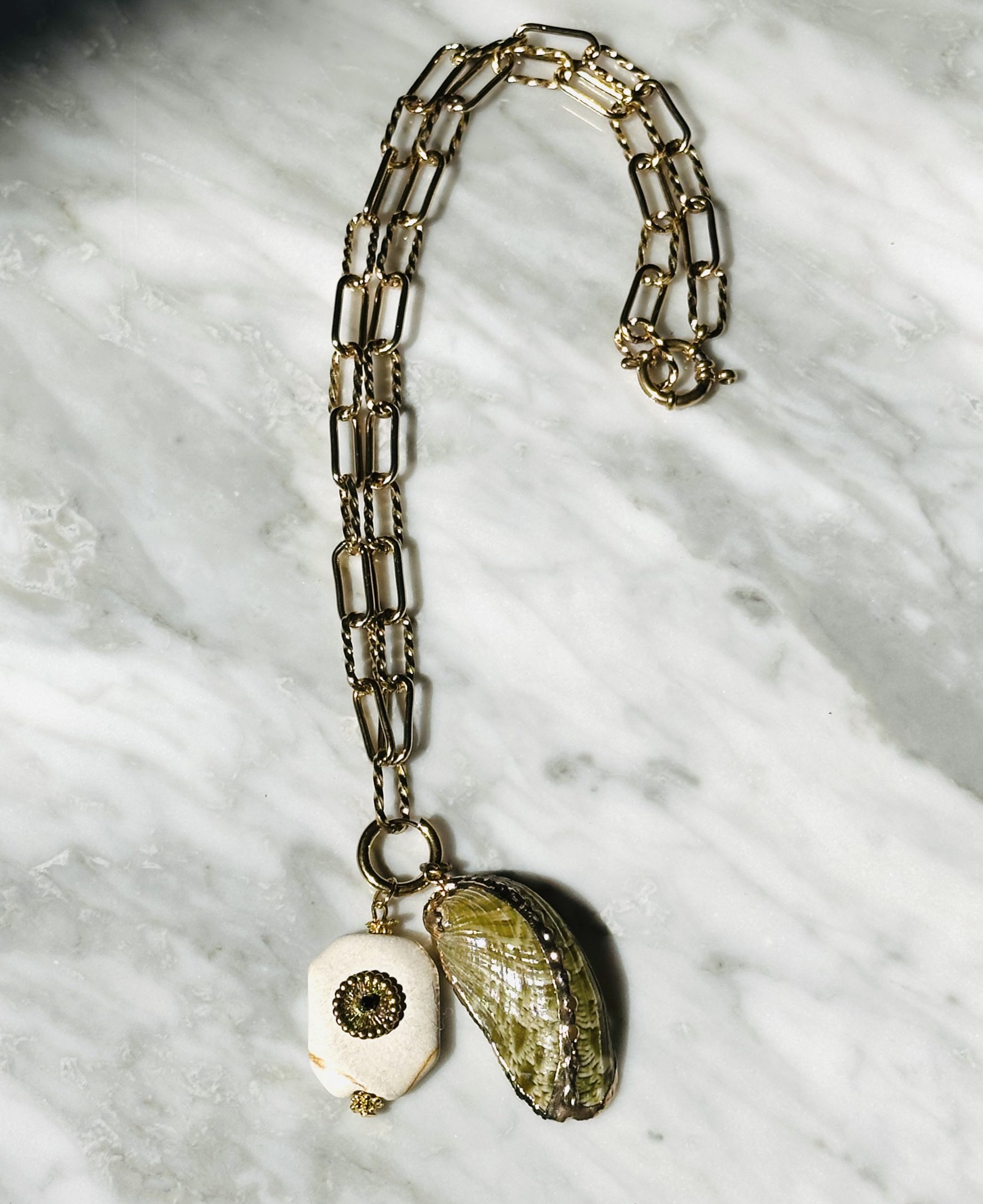 Le second pendentif, taillé dans une coquille d’ormeau, révèle ses irréductibles reflets irisés — verts, bleus, dorés — sublimés par une dorure qui en accentue le caractère précieux et organique.