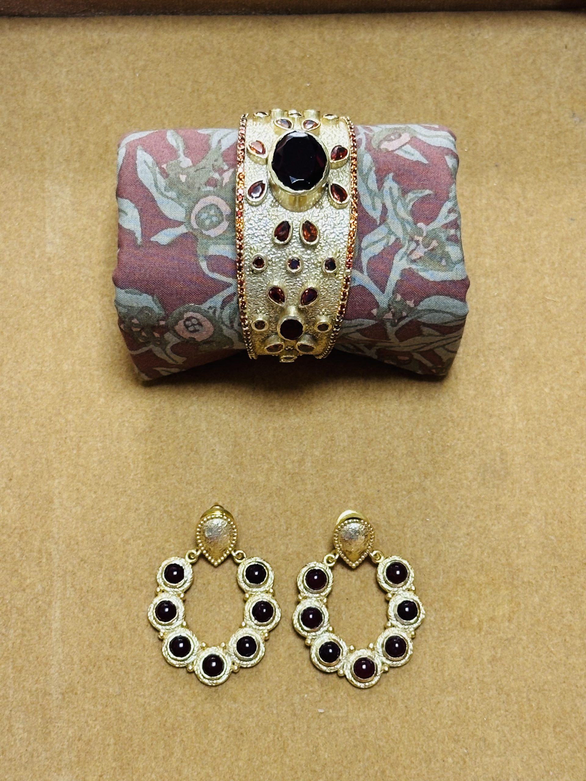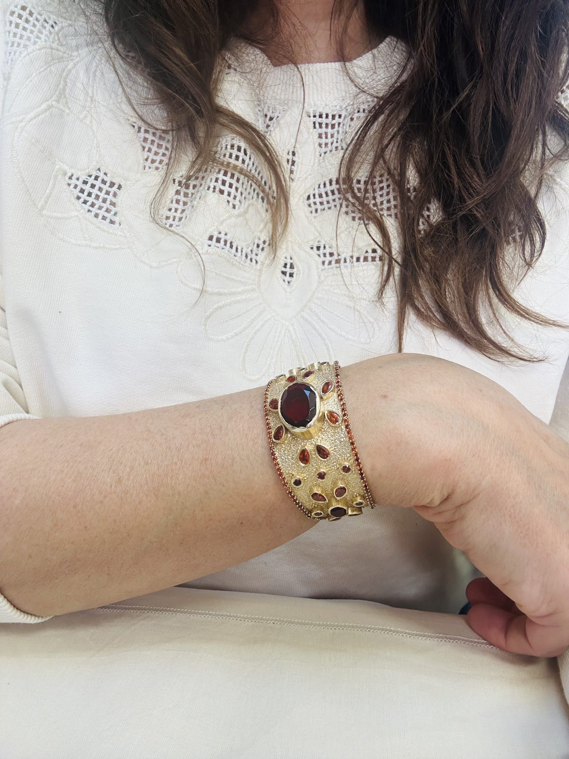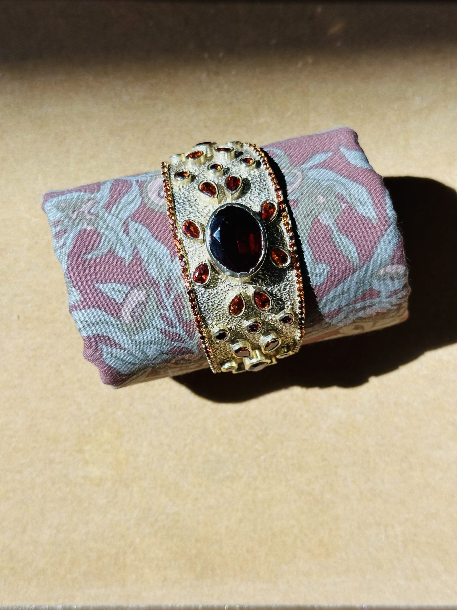 Une manchette qui commande l’attention. Sur un laiton doré martelé — large, texturé, souverain — un grand cabochon ovale de grenat bordeaux trône au centre, profond et magnétique, entouré d’une constellation de grenats rouge orangé en forme de gouttes, chauds comme des braises. Sur les bordures, une ligne de strass orange trace un contour étincelant qui enflamme l’ensemble. Pierre de passion et de vitalité, le grenat ancre et enflamme à la fois — comme le fort Amber au crépuscule du Rajasthan.